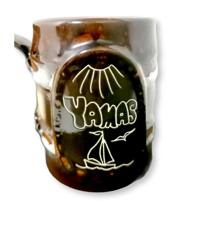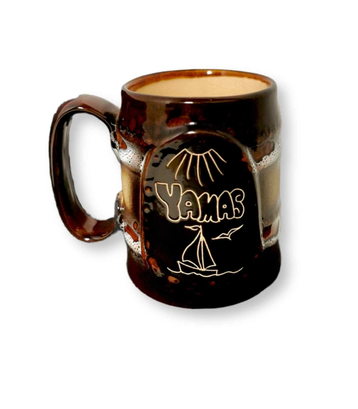 Ποτήρι μεγάλο για μπύρα σε χρώμα καφέ. Είναι κατασκευασμένη στο χέρι και πάνω είναι σκαλισμένη η λέξη “YAMAS” που στα ελληνικά σημάνει εις υγείαν.