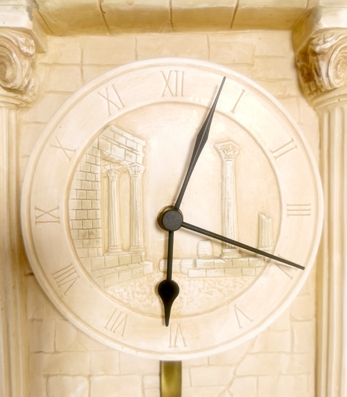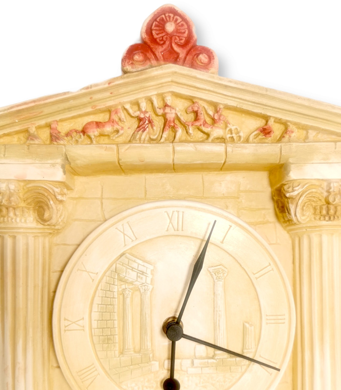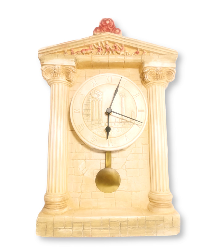 Ρολόι τοίχου με λατινικούς αριθμούς και εκκρεμές, κατασκευασμένο από γύψο. Έχει την όψη αρχαίου ναού της Ελλάδας, στο πάνω μέρος απεικονίζεται το αέτωμα του Παρθενώνα και στο κέντρο ένα μέρος της Ακρόπολης.