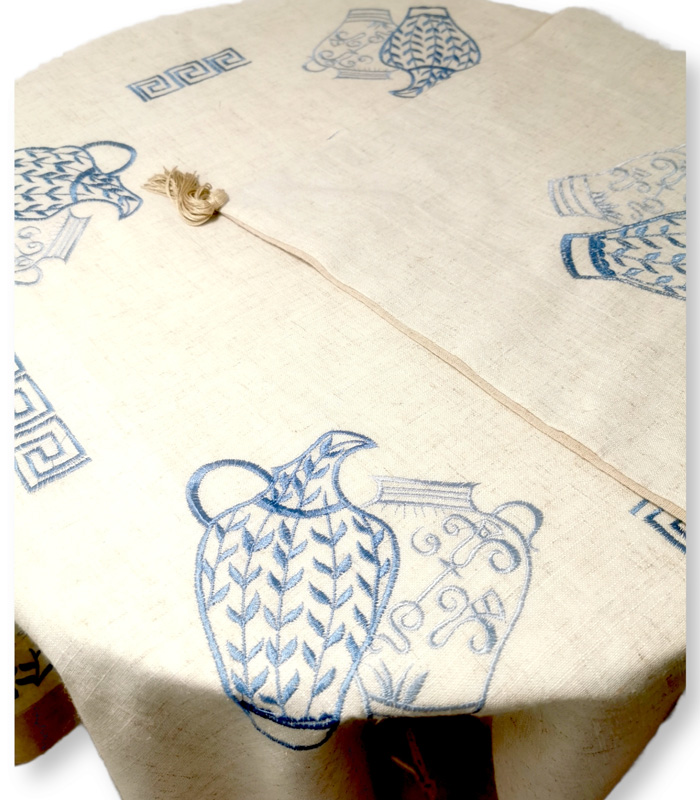 Παραδοσιακό τραπεζομάντηλο σε μπέζ χρώμα με σχέδιο τον μαίανδρο και αρχαία κανάτα. Οι ραφές είναι χρώματος μπλέ και γαλάζιου.